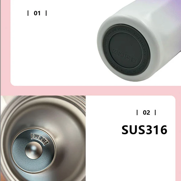 இது வைக்கோலுடன் வெற்றிட காப்பிடப்பட்ட எஃகு பாட்டில் ஆகும், பொருள் 316 எஃகு (உள் பகுதி) மற்றும் 201 எஃகு (வெளிப்புற சுவர்) ஆகியவற்றால் ஆனது, திறன் 500 மில்லி ஆகும்.