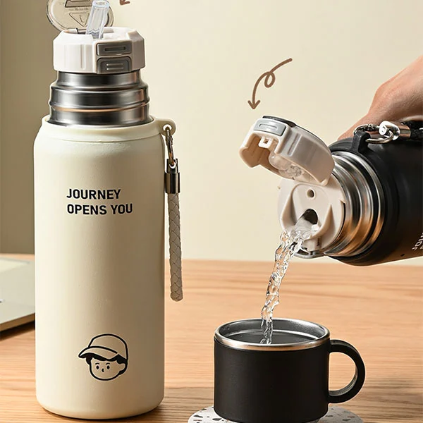 மூடி பகுதி: பிபி மூடி மற்றும் எஃகு மூடி. எஃகு மூடியின் மேல் பகுதியை ஒரு சிறிய கோப்பையாக தனியாகப் பயன்படுத்தலாம். சீல் செய்யப்பட்ட மூடி பிரிவு இரட்டை குடிக்கும் மூடி. நேரடி குடிப்பதற்காக அதைத் திறக்க ஒரு சுவிட்சை அழுத்தலாம், அதே நேரத்தில் சிறிய கோப்பையில் தண்ணீர் நுழைய அனுமதிக்கிறது. மற்ற பொத்தானை வைக்கோல் வழியாக குடிநீர் தண்ணீரில் வைக்கோல் பகுதியைத் திறக்கலாம்.