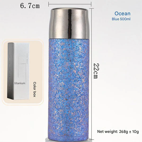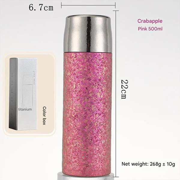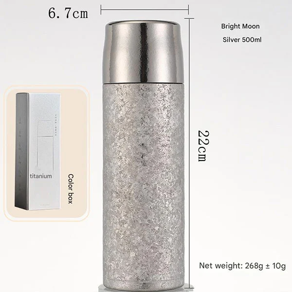 டைட்டானியம் தண்ணீர் பாட்டில்கள் இரட்டை அடுக்கு வெற்றிட காப்பு வடிவமைப்பை ஏற்றுக்கொள்கின்றன. எங்களின் மெட்டல் வாட்டர் பாட்டில்கள் குளிர்ந்த கோலாவாக இருந்தாலும் அல்லது சூடான காபியாக இருந்தாலும் உங்கள் பானங்களுக்கு சிறந்த காப்பு வழங்குவதாக நிரூபிக்கப்பட்டுள்ளது. சூடான பானங்களை 8 மணி நேரம் வரை சூடாக வைத்திருக்கலாம், அதே நேரத்தில் குளிர் பானங்கள் 12 மணி நேரம் வரை சூடாக வைக்கப்படும். (பரிசோதனை தரவு: காப்பு: 99 ° C அறை வெப்பநிலையில் தண்ணீரைச் சேர்க்கவும், 6 மணிநேர காப்புக்குப் பிறகு வெப்பநிலை 60 ° C ஐத் தாண்டும்; குளிர்பதனம்: 0 ° C அறை வெப்பநிலையில் தண்ணீரைச் சேர்க்கவும், 6 மணிநேர காப்புக்குப் பிறகு வெப்பநிலை 5 ° C க்கும் குறைவாக இருக்கும்.)